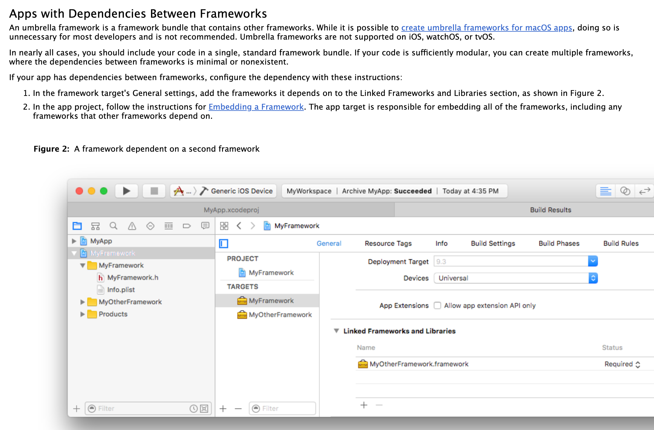 Umbrella framework : ํ๋ ์์ํฌ๊ฐ ๋ค๋ฅธ ํ๋ ์์ํฌ๋ฅผ ํฌํจํ๋ ํํ. macOS์์๋ ๊ฐ๋ฅํ์ง๋ง ์ง์๋๋ ๊ตฌ์กฐ. iOS, watchOS, tvOS์์๋ ๋ถ๊ฐ๋ฅํจ. ๋ฐ๋ผ์ ํ๋ ์์ํฌ ์์ ๋ค๋ฅธ ํ๋ ์์ํฌ๋ฅผ ๋ฃ์ง ๋ง๊ณ Embedding a framework ๋ฐฉ์์ ์ฌ์ฉํด์ผ ํจ.