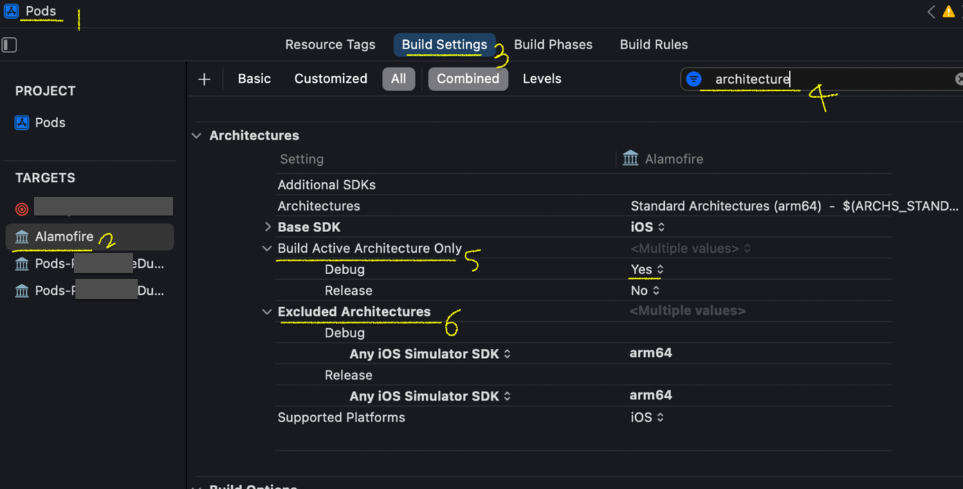 - workspace์์ pods ํด๋ฆญ → Targets ์ค ๋ฌธ์ ๊ฐ ๋ฐ์ํ ๋ผ์ด๋ธ๋ฌ๋ฆฌ ์ ํ → Build Settings → architecture ๊ฒ์ → Build Active Architectures Only๊ฐ Yes๋ก ๋์ด์๋์ง ๊ทธ๋ฆฌ๊ณ Excluded Architectures๊ฐ iOS simulator์ ๋ํด์๋ arm64๊ฐ ์ ์ธ๋์ด ์๋์ง ์ฒดํฌ ํด์ค์ผ ํจ. ์๋ ์ฌ์ง ์ฐธ๊ณ .